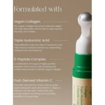 Sérum contour des yeux au collagène végétalien, hydrate et raffermit la peau délicate. Appliquer une petite quantité sur le contour des yeux propre, puis tapoter doucement jusqu’à absorption complète.