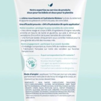 Crème nourrissante et hydratante, spécialement conçue pour protéger et adoucir la peau délicate des bébés et enfants.