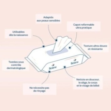 Lingettes nettoyantes à l’eau, douces et hypoallergéniques, spécialement conçues pour nettoyer délicatement la peau sensible des bébés.