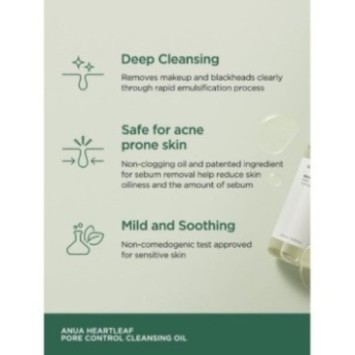 L’ANUA Huile Nettoyante pour le Contrôle des Pores Heartleaf est formulée avec de l’extrait pur de Heartleaf (Houttuynia Cordata), reconnu pour ses propriétés anti-inflammatoires et purifiantes. Elle aide à réduire l’excès de sébum, nettoyer les pores en profondeur et apaiser les peaux sensibles ou sujettes aux imperfections.