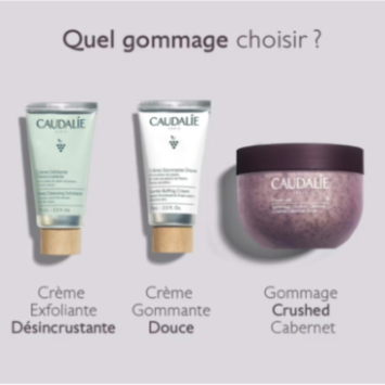Le Gommage Crushed Cabernet Vinosculpt est le soin exfoliant du Programme Fermete Caudalie. Cette routine en 4 etapes comprend le Gommage Crushed Cabernet, le Baume Corps Lift et Fermete, le Concentre Minceur et les Tisanes Bio Drainantes. Resultat : une taille de pantalon en moins des 28 jours. Etude clinique, test dobjectivation, 21 volontaires, 28 jours